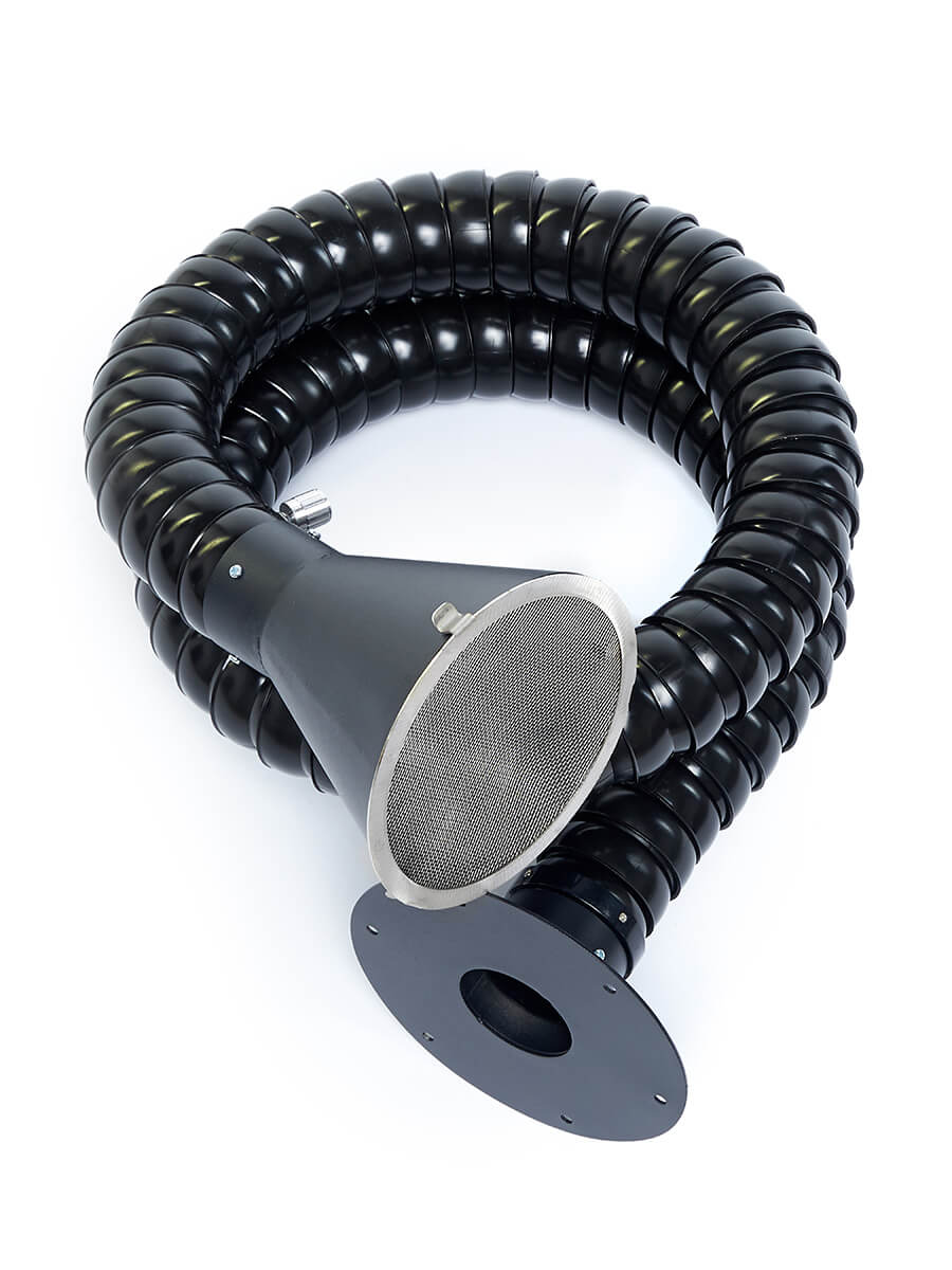 Загрязнённый воздух втягивается через гибкий поворотно-шарнирный рукав, что позволяет производить точечный забор прямо из зоны работ. Далее поток проходит через три ступени очистки: